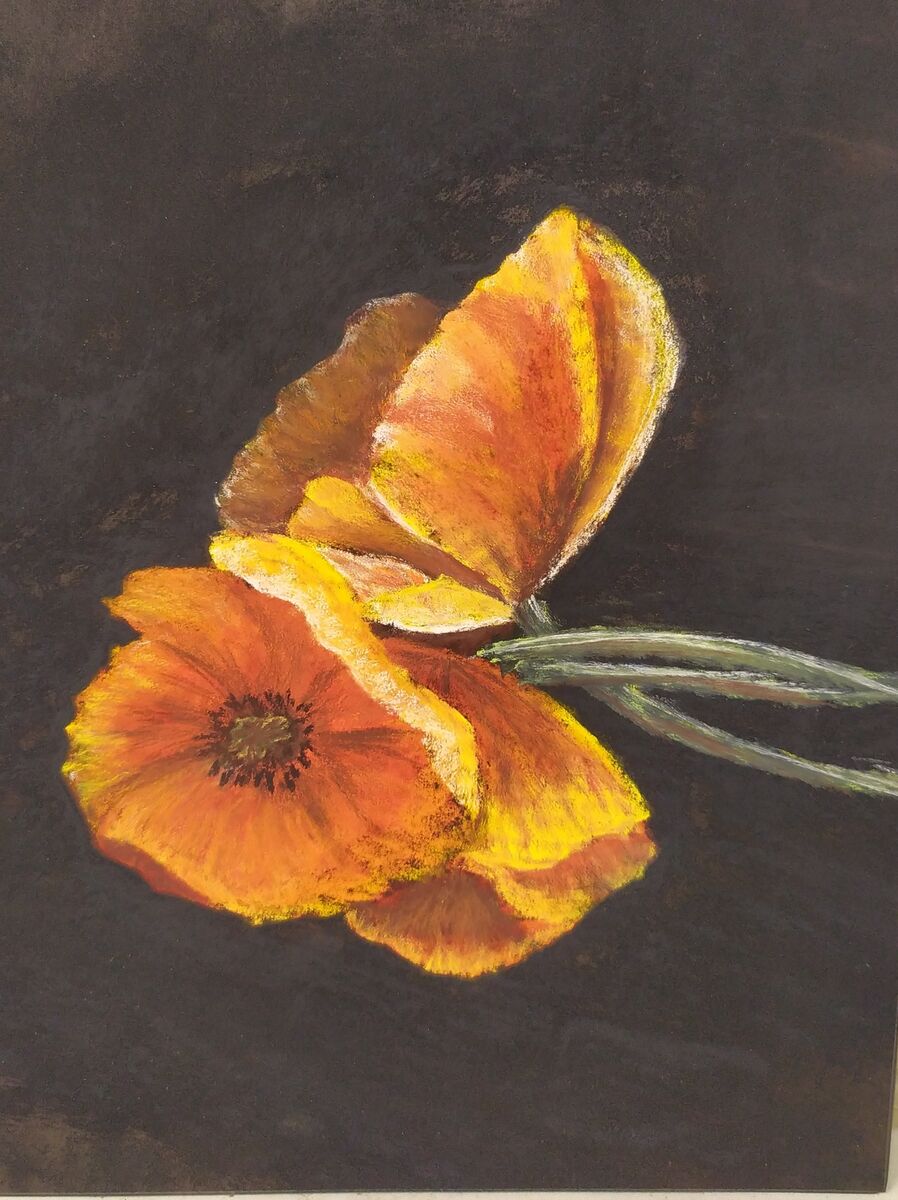 Poppies. Drawing with hard pastels on fine sandpaper. Approx 13x18 cm. Unframed. As it is drawn on sandpaper, and not on special pastel paper, I cannot guarantee that it is of archival quality. Though it is 1 year old now and the colours remain unchanged.